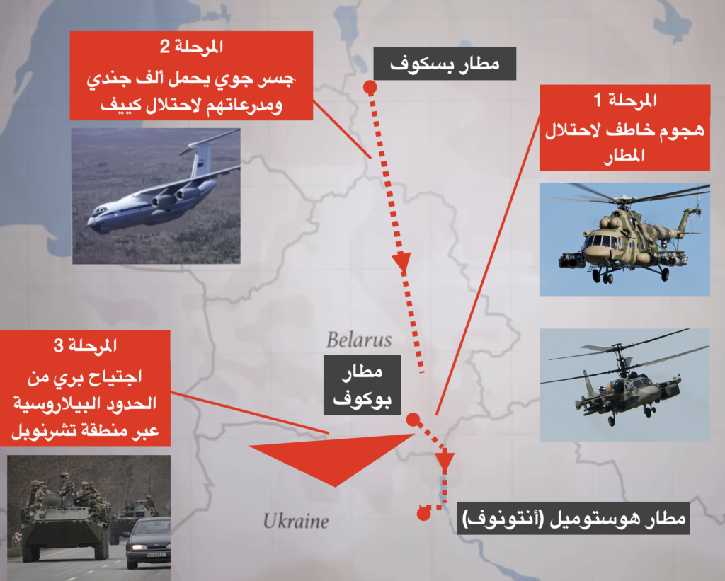 يمكن اختصار الخطة الروسية بعملية عسكرية خاصة من ثلاث مراحل، تقوم القوات المجوقلة الخاصة في مرحلتها الأولى باحتلال المطار وتأمين محيطه وفتح المدرج لبداية المرحلة الثانية حيث تقوم طائرات النقل العسكري بنقل 1000 مقاتل مع مدرعاتهم إلى المطار بهدفا احتلال كييف وقتل أو خطف أو إخضاع قياداتها السياسية والعسكرية ولتصل القوات البرية في مرحلتها الثالثة نهاية ذات اليوم واصلة خطوط الإمداد بين القوات الروسية في كييف وخطوط الامداد في دولة بيلاروسيا. مجبرة أوكرانيا في النهاية على الاستسلام العسكري وعلى تنفيذ الشروط الروسية مهما كانت. وهكذا تنتهي الحرب في ثلاثة أيام بسرعة خاطفة ويسجل بوتين اسمه في التاريخ الروسي كقائد أعاد إلى روسيا أمجادها وسمعتها وبسط سيطرتها على أوكرانيا مهد حضارتها والتي خسرها الاتحاد السوفيتي بعد انحلاله.