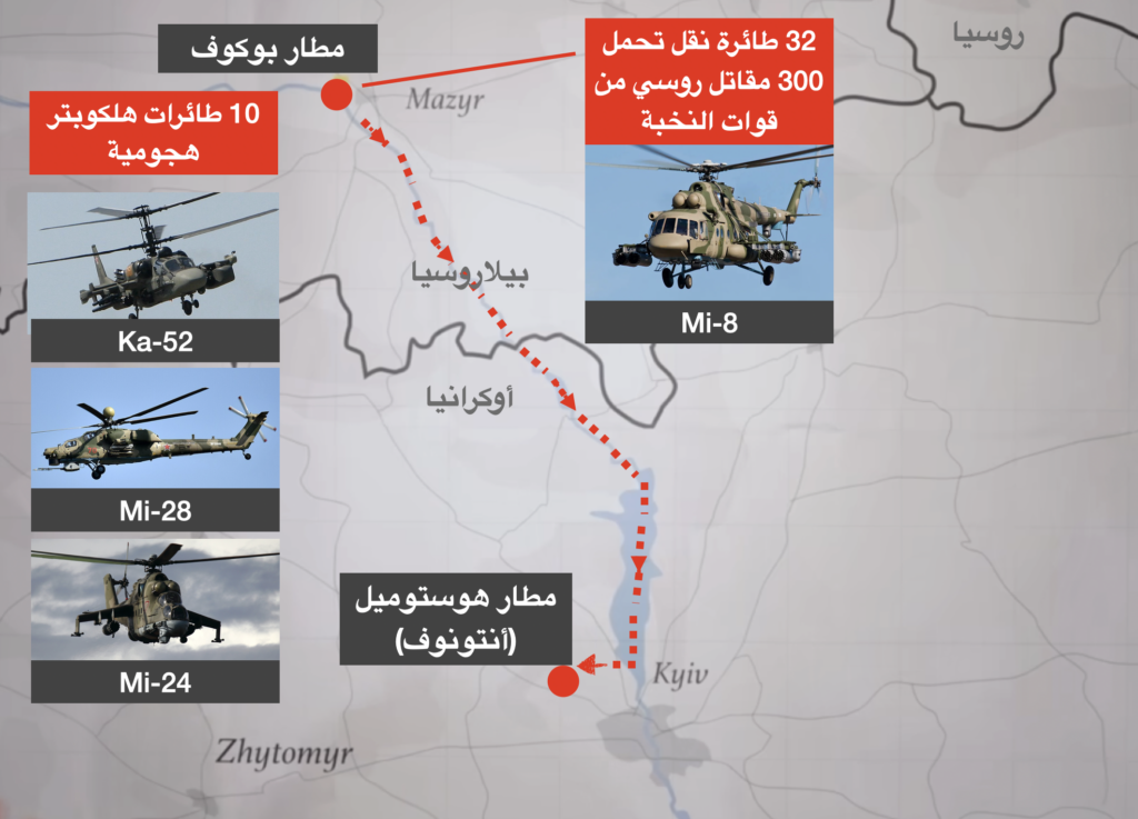 في الساعة 9:00 وعلى بعد 170 كم شمال مدينة هوستوميل، انطلقت مجموعة كبيرة من طائرات الهيليكوبتر الروسية من مطار بوكوف البيلاروسي جنوبا عبر الحدود البيلاروسية-الأوكرانية لتعبرها تباعاً الساعة 9:30 على علو منخفض تجنبا للرادار ومحتضنة لمجرى نهر دنبرو Dnipro على ارتفاع قليل من سطح الماء. تضمنت المجموعة المغيرة ما لا يقل عن 34 طائرة 20 منها لنقل الجنود من طراز Mi-8 تحمل قوات مجوقلة تحميها 10 طائرات هليكوبتر هجومية من طراز K-52 الحديثة وطائرات هليكوبتر إضافية من طراز Mi-24 و Mi-28 الأقدم. حملت هذه الطائرات حوالي 300 جلهم من اللواء 31 حرس جوي، ومن اللواء 45 القوات الخاصة. يعتبرون جميعا من قوات النخبة الروسية ذائعي الصيت في الأوساط العسكرية.