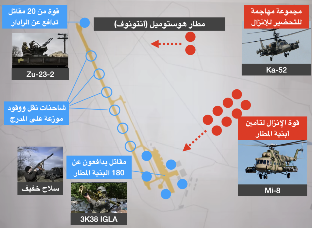 فجر 24 شباط/فبراير 2022، وبعد دقائق قليلة من إعلان الرئيس الروسي فلاديمير بوتين عن بدء “العملية العسكرية الخاصة” في أوكرانيا، والتي أصبحنا نعلم فيما بعد أنها تعني اجتياح كامل الأراضي الأوكرانية، انطلقت صواريخ كروز من طراز 3M-54 لتضرب بعد دقائق حوالي الساعة 6:00 القاعدة 3018 التابعة للحرس الوطني الأوكراني في بلدة هوستوميل Hostomel على بعد 10 كم من مدينة كييف. وهي القاعدة العسكرية قرب مطار هوستوميل الدولي Hostomel International Airport المخصص لنقل البطائع الذي يتميز بمدرج بطول 3.5 كم عريض ومن الاسمنت المسلح القادر على تحمل الأوزان الكبيرة جدا.